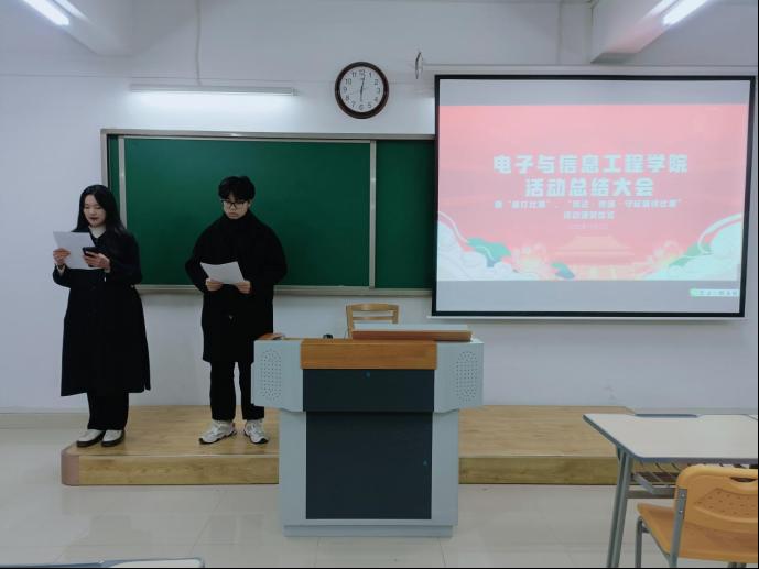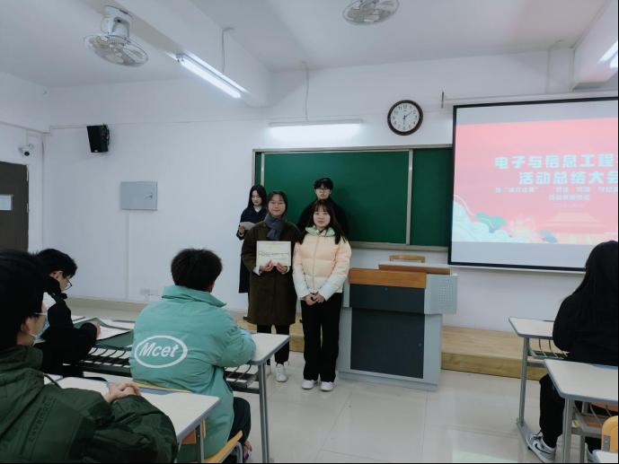 12月2日晚6点,电子与信息工程学院于二教323教室举办了电子与信息工程学院活动总结大会,并在此次会议上为“速打比赛”、“普法、修德、守纪演讲比赛”获奖同学颁奖。辅导员侯绪芳老师、刘倩老师、杨雯雯老师及孙浩老师作为教师代表出席了本次颁奖仪式,参加本次颁奖仪式的还有获奖学生及部分电子与信息工程学院学生会成员。