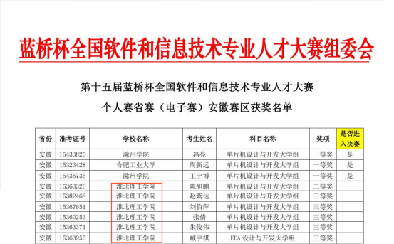 近日,第十五届蓝桥杯全国软件和信息技术专业人才大赛个人赛省赛安徽赛区圆满落幕。淮北理工学院电子与信息工程学院首次组织并筛选出17位学子参赛。其中4位参加软件赛的学子荣获省级大学B组二等奖1项和省级大学B组三等奖2项,13位参加电子赛的学子荣获省级大学生组二等奖1项和省级大学组三等奖5项。部分获奖名单如图所示: