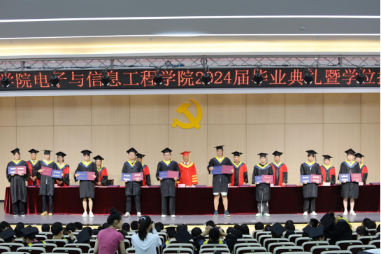 仲夏时节,骊歌渐响;莘莘学子,奔赴九州。6月12日下午,电子与信息工程学院2024届毕业典礼暨学位授予仪式在学术报告厅隆重举行。校党委副书记、校长杨兵、教务处处长陈国平、电子与信息工程学院党总支书记、院长朱昌杰、校学位委员会委员吕虹教授、电子与信息工程学院学位委员会委员及院长书记助理在主席台就坐。300余名师生共同见证这一庄严而神圣的时刻。毕业典礼由电子与信息工程学院党总支书记、院长朱昌杰主持。