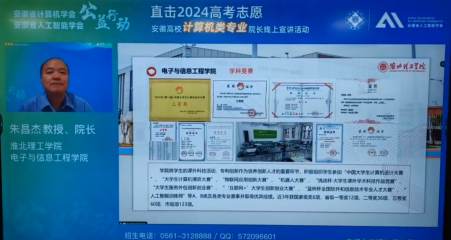 安徽省计算机学会、安徽省人工智能学会联合省内31所高校计算机学院,针对2024安徽新高考综合改革,开展了一场公益性专业招生线上宣讲活动,直播观看达4万+人次。6月27日下午17:30—18:00,我校电子与信息工程学院院长朱昌杰宣讲我校计算机科学与技术、人工智能、数据科学与大数据技术、软件工程、电子信息工程、通信工程等专业招生情况。