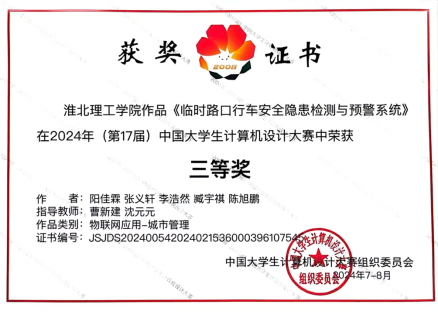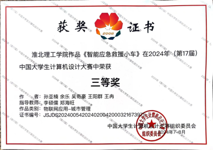 2024年8月13日至17日,第17届中国大学生计算机设计大赛全国总决赛在厦门举行,由我校教师李硕儒、郑海旺指导的孙亚楠、余乐、吴奇豪、王阳群、王冉所组成的参赛队伍的《智能应急救援小车》作品以及我校教师曹新建、沈元元指导的阳佳霖、张义轩、李浩然、臧宇祺、陈旭鹏所组成的参赛队伍的《临时路口行车安全隐患检测与预警系统》作品,在众多参赛作品中脱颖而出,均获得国家级三等奖。