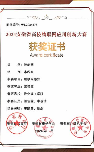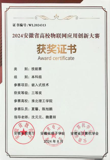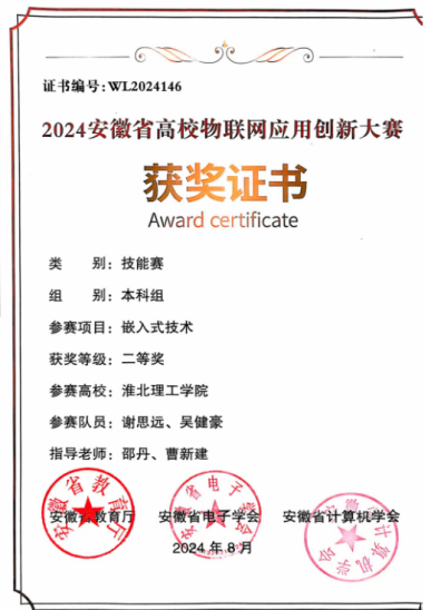 2024年5月11日至18日,我院曹新建、王璐鑫和李硕儒等作为指导老师带领夏馨、陈旭鹏、阳佳霖、孙亚楠等学生参加安徽省高校物联网应用创新大赛,大赛由安徽省教育厅主办、安徽大学和安徽省计算机学会、安徽省电子学会承办,整个比赛过程充分展现了电子与信息工程学院学子较扎实的理论功底、实操能力和良好精神风貌。