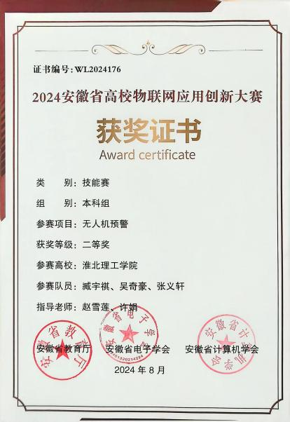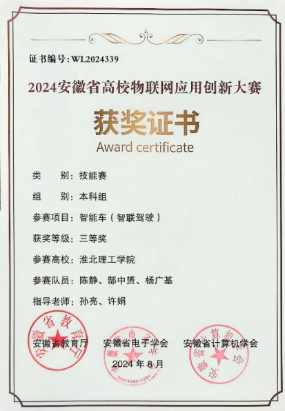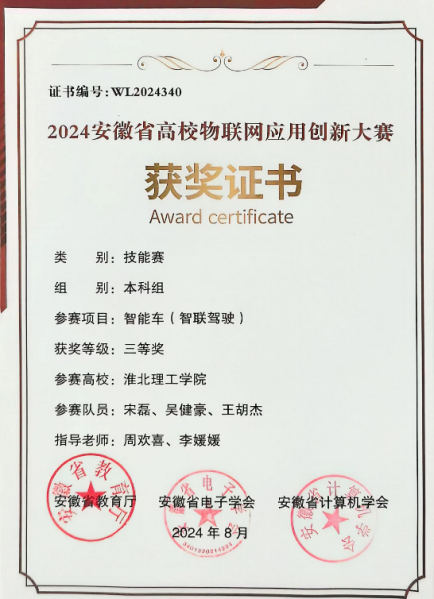 我校参赛队伍在智能车(智联驾驶)、无人机预警、嵌入式A与C、物联网感知以及作品赛六大赛道中奋力角逐,展现了团队协作与拼搏精神。经过激烈的比拼,我们取得了较好的成绩:智能车(智联驾驶)赛道荣获省级二等奖1项、三等奖2项;无人机预警赛道省级二等奖1项;嵌入式A赛道省级二等奖1项、三等奖2项;嵌入式C赛道获得省级三等奖1项;物联网感知与作品赛赛道则各获省级三等奖1项。这些荣誉不仅是对参赛师生辛勤付出的肯定,更是对我们学院科技创新实力的有力证明。部分获奖证书如下: