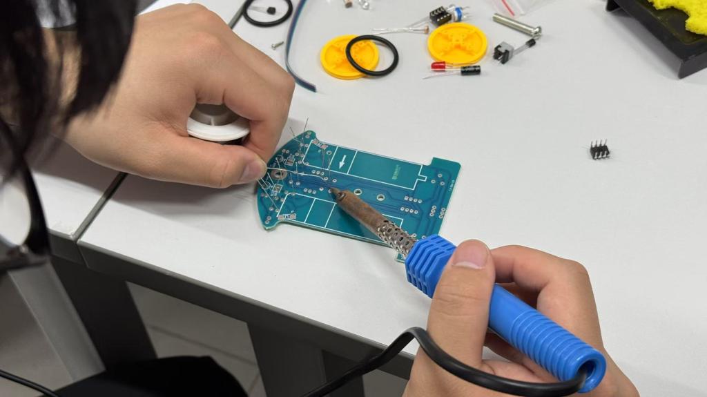 随后,学生们进入循迹小车制作环节。活动采用红色LED作为光源,光线通过地面反射到光敏电阻上,通过检测光敏电阻的阻值变化,判断小车是否行驶在白色区域。经过一个多小时的努力,一辆辆精巧的循迹小车在学生们手中诞生。