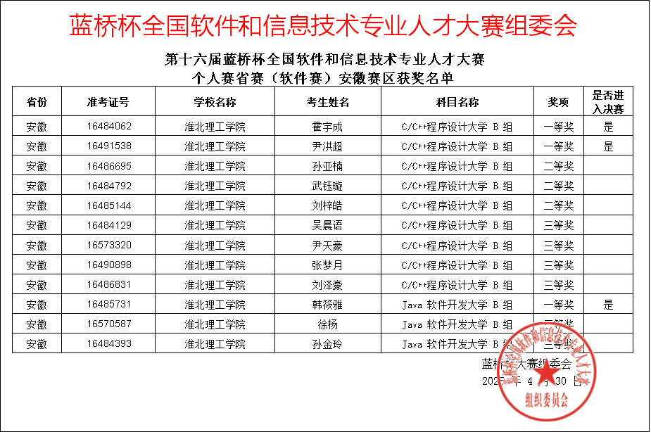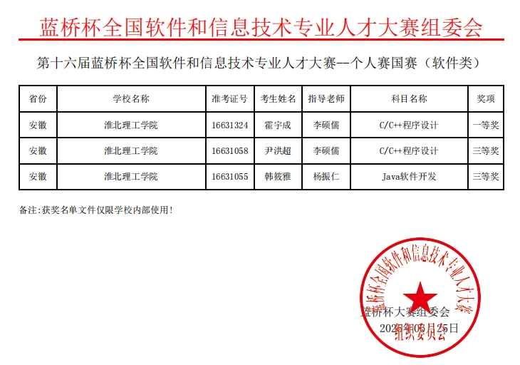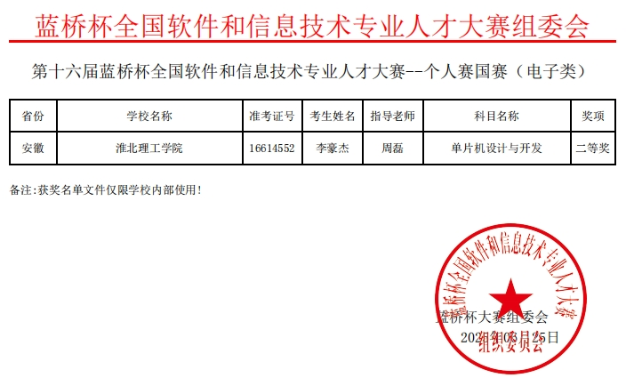 我校电子与信息工程学院学子凭借扎实专业功底在第十六届“蓝桥杯”全国软件和信息技术专业人才大赛全国总决赛中,获国家一等奖1项、国家二等奖1项、国家三等奖2项;在第十六届“蓝桥杯”全国软件和信息技术专业人才大赛安徽赛区,获省级一等奖4项、省级二等奖14项、省级三等奖13项。