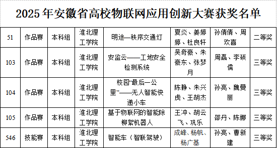 我校电子与信息工程学院学子在2025年安徽省高校物联网应用创新大赛中获省级二等奖1项、三等奖4项,展现出扎实的专业素养与创新实践能力。