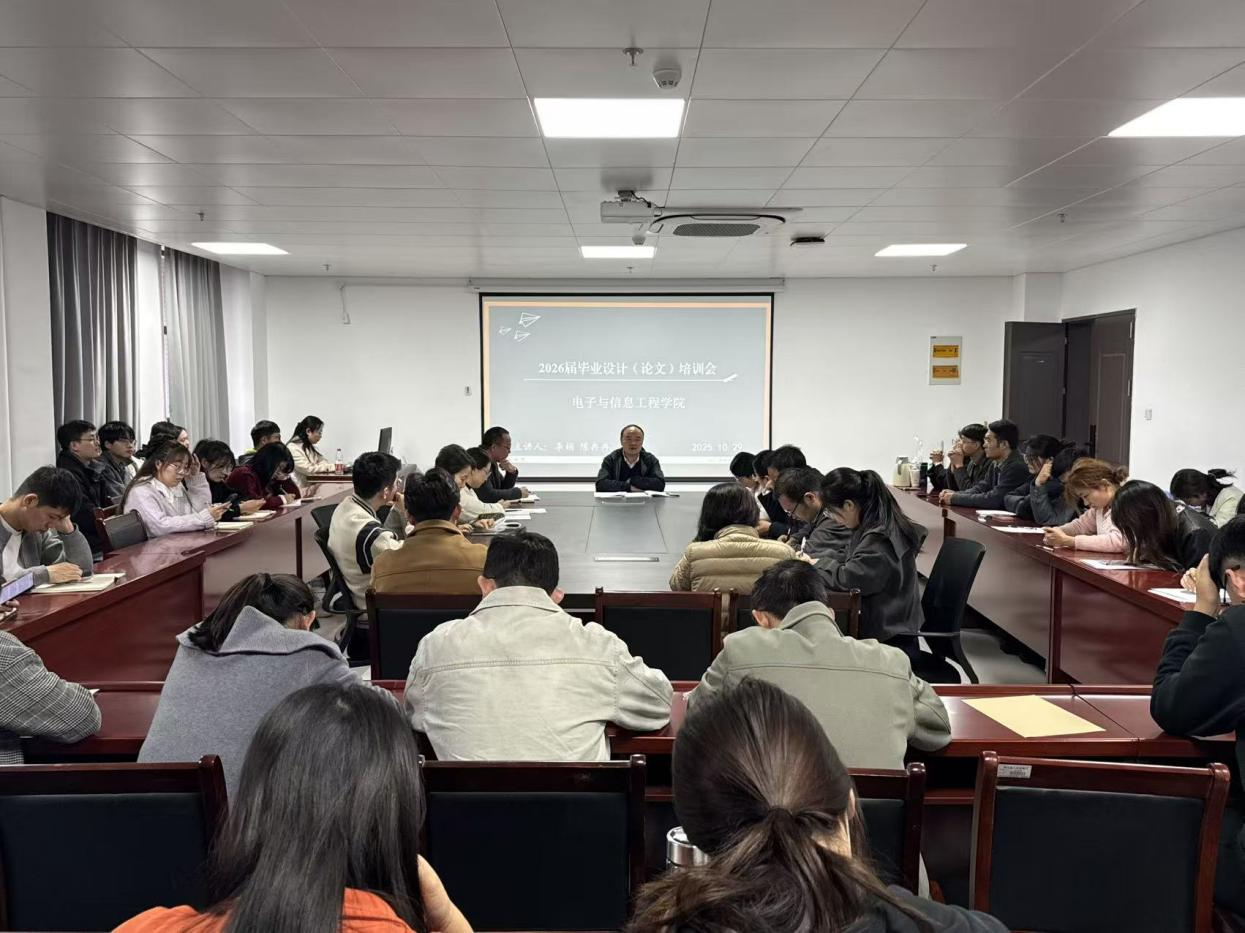 为扎实推进2026届本科毕业设计(论文)工作,明确工作要求与规范,确保毕业设计(论文)质量,2025年10月29日下午4点,电子与信息工程学院在行政楼713会议室组织召开2026届毕业设计(论文)培训会。学院全体教职员工参会,会议由学院院长朱昌杰主持。