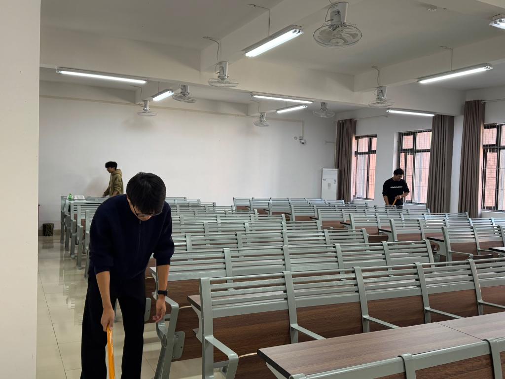 在固定教室清洁板块,2025级各班级以班级为单位,明确分工、协同协作。同学们携带清扫工具,严格按照“清扫—擦拭—整理—检查”的流程开展工作:先对教室内地面进行全面清扫,清除纸屑、灰尘等杂物;再用洁净抹布对黑板、讲台、课桌椅表面及门窗玻璃进行细致擦拭,确保无污渍、无浮尘;最后对课桌椅进行统一归位,整理教室内各类物品,营造整齐有序的教学环境。经过系统清洁,各固定教室面貌焕然一新,为后续教学活动的开展提供了良好保障。