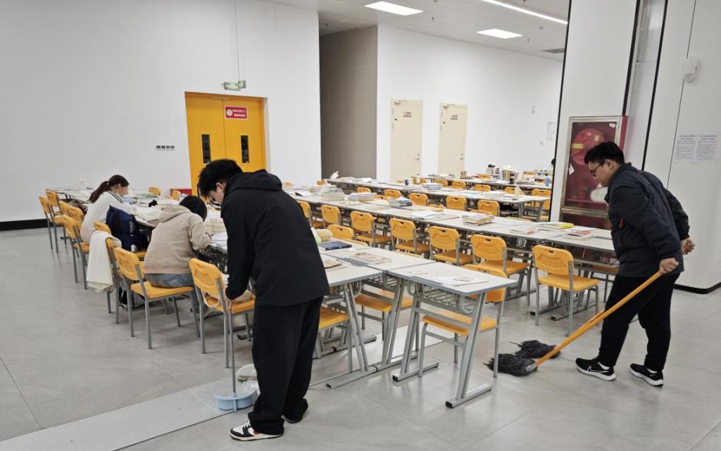 非固定教室与图书馆自习室的卫生清洁工作由勤工助学学生队伍负责。针对非固定教室使用频率高、人员流动大的特点,学生们重点对座椅扶手、门把手、开关等高频接触部位进行擦拭消毒,同时对墙角、窗台、插座缝隙等卫生死角进行深度清理,有效消除卫生隐患;在图书馆自习室,学生们秉持“轻操作、不干扰”的原则,在不影响读者学习的前提下进行清洁,整理散乱书籍,清除桌面残留污渍,维护安静、整洁的阅读空间,为广大师生营造了舒适的学习环境。