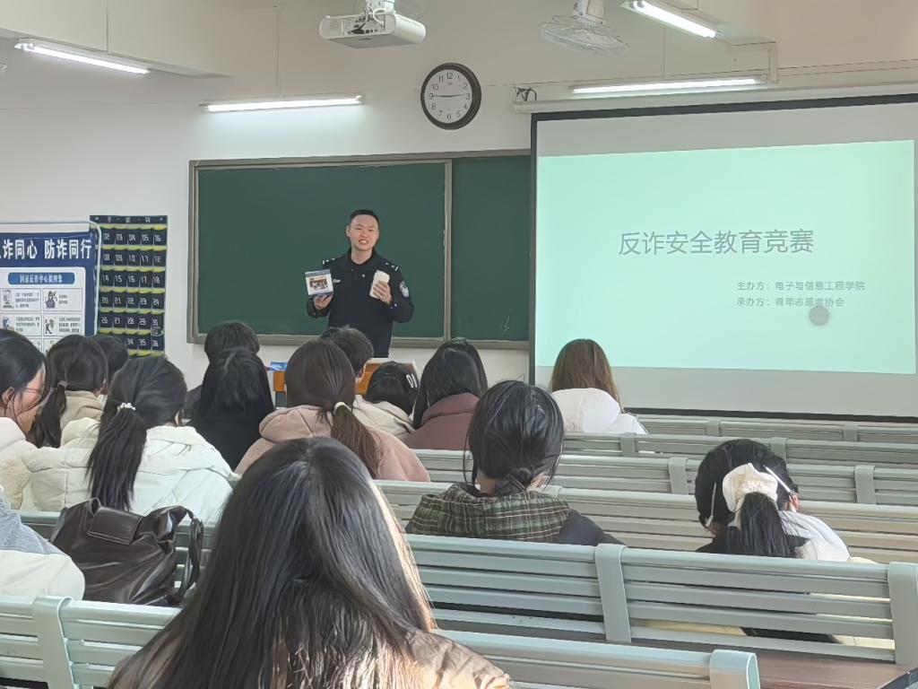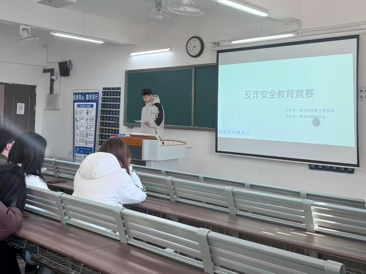 秋意渐浓,警钟长鸣。随着电信网络诈骗向校园领域渗透,刷单返利、虚假网贷等诈骗手段对大学生财产安全与心理健康造成双重威胁。为落实校园反诈工作部署,提升学生识骗、防骗、拒骗能力,11月19日电子与信息工程学院主办,联合青年志愿者协会于本日下午在1教421室举办反诈竞赛活动,近120名学生到场参与。