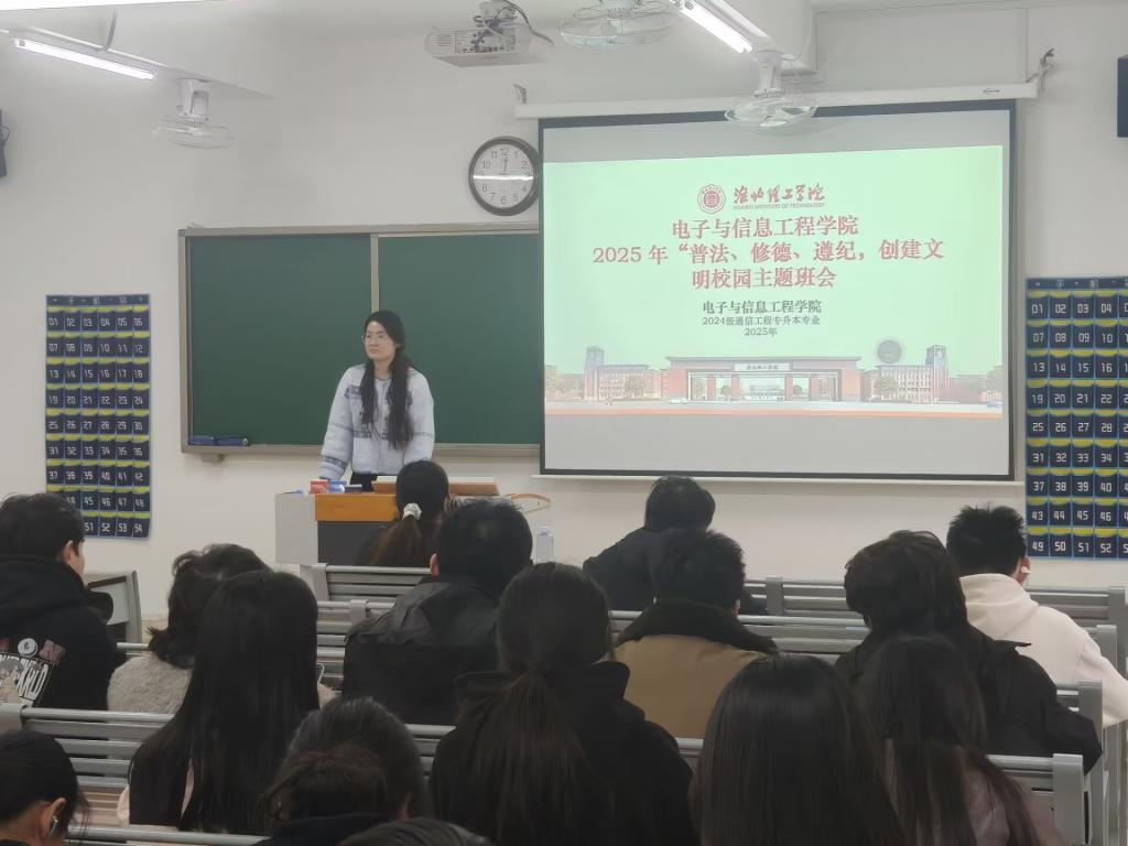 为深入落实学校 2025 年 “普法、修德、遵纪,创建文明校园” 专项活动要求,筑牢立德树人根本任务,引导学子强化法治观念、涵养道德品格、严守纪律规范,电子与信息工程学院组织全院各班级开展系列主题班会,数百名学子齐聚课堂,以互动交流、案例研讨等多元形式,让文明理念入脑入心,为文明校园建设凝聚青春共识。