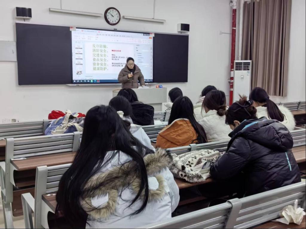 此外,辅导员还围绕假期出行交通安全,提醒学生遵守交通规则,不乘坐无牌无证、超载超员的非法营运车辆,注意雨雪天气出行安全;针对食品安全,告诫学生不购买“三无”食品,不暴饮暴食,养成良好的饮食习惯;结合冬季常见疾病特点,普及健康防护知识,引导学生加强体育锻炼,做好防寒保暖,保持规律作息。