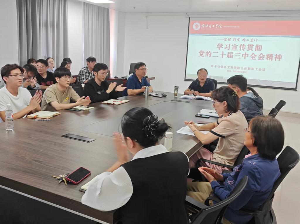 2024年9月25日下午,电子与信息工程学院召开全院教职工会议,深入学习宣传贯彻党的二十届三中全会精神,会议由党委书记、院长朱昌杰主持,全院教职工参加此次会议。