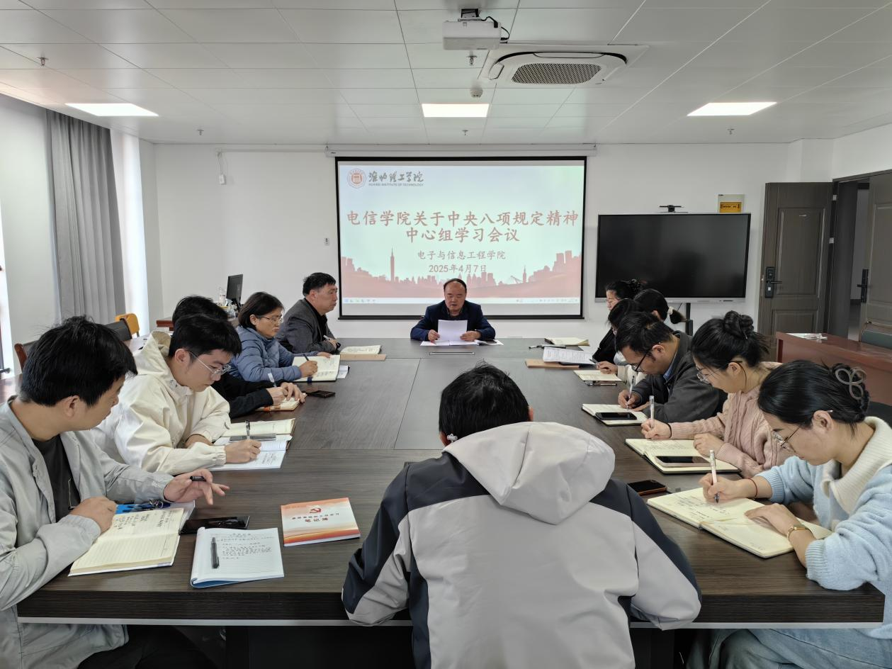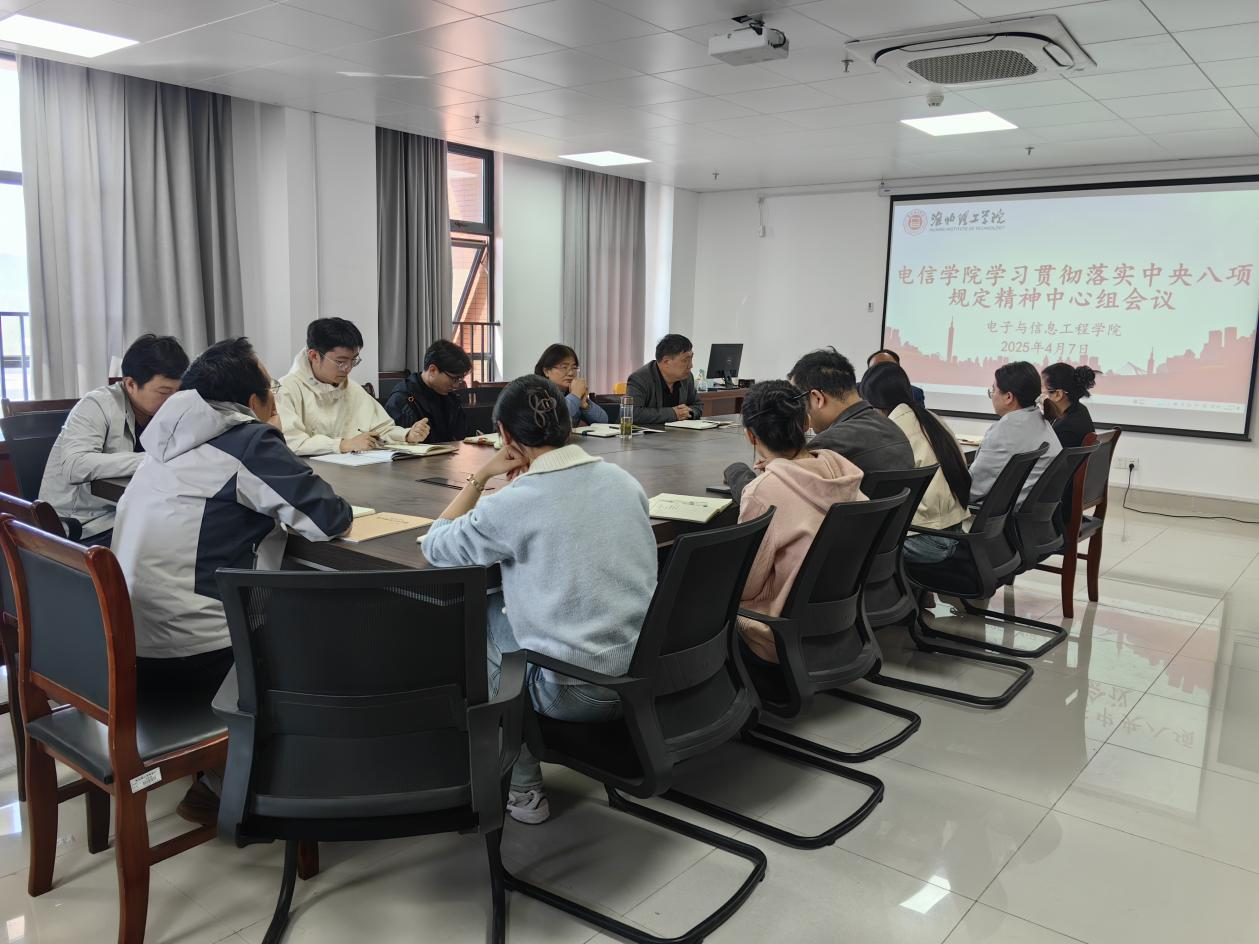 2025年4月7日,电子与信息工程学院在行政楼713会议室召开中心组会议,专题学习贯彻落实中央八项规定精神。本次会议由院党总支书记朱昌杰主持,院党总支委员、各党支部书记、各学科带头人及各教研室主任参加会议,旨在通过深入学习与研讨,推动学院作风建设常态化长效化,为学院高质量发展提供坚强保障。