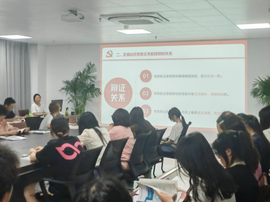 陈旭茹老师介绍了党员的八项基本义务与八项权力,着重指出了党员履行义务是保持党的先进性的需要,党员履行义务是提高党的战斗力的需要,党员履行义务是保证党的基本理论、基本路线和基本纲领贯彻执行的需要。要对行使党员的权利的重要性有清醒的认识,要学会用马克思主义的立场、观点和方法去分析问题,辨明是非,认清本质,要树立对党的事业高度负责的精神。让同学们知道了义务和权利是辩证统一的,只有切实履行党员的义务,才能切实享有党员的权利。