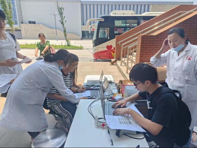 上午9点,献血活动正式开始,志愿献血的同学们陆续到来。大学生志愿者们询问他们的身体情况,指导符合献血要求的献血者进行线上扫码登记,并填写无偿献血志愿申请表。随后志愿者对献血者进行血压、脉搏的测量,以确保献血者自身的安全。献血前的准备事项全部完成后,献血者登上献血车,在医护人员的帮助下,完成献血。